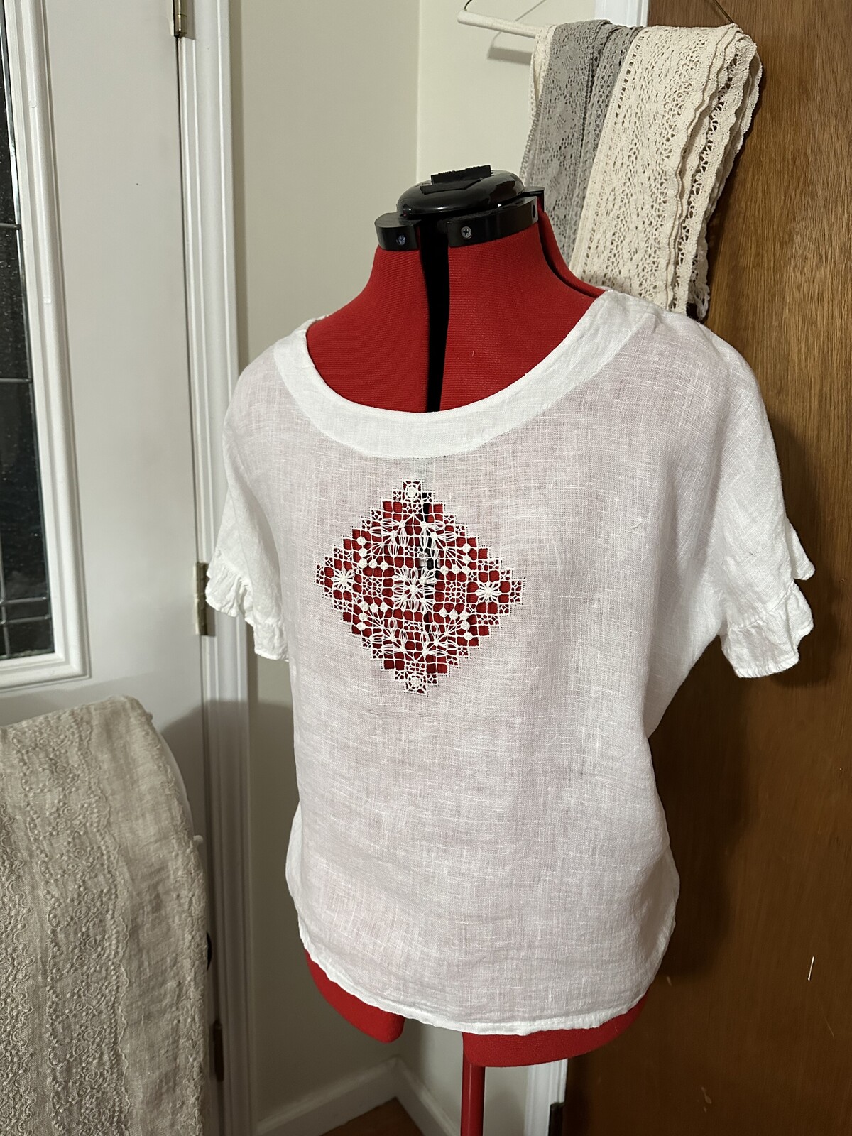 Салфетку/декоративную наволочку и чокер в технике «Крестецкая строчка»